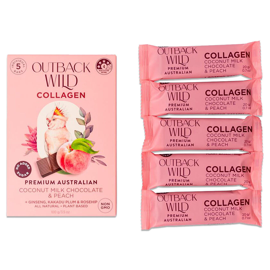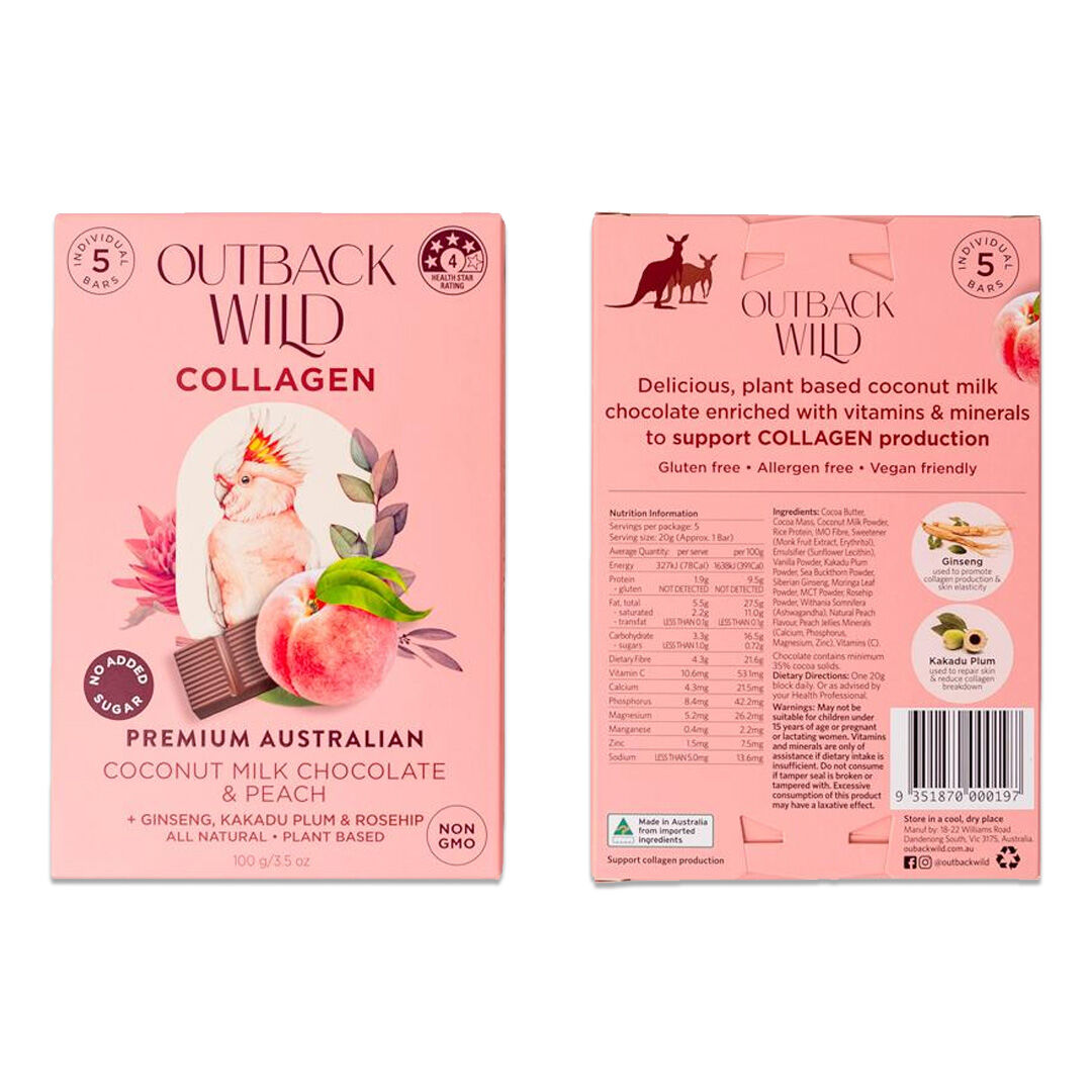 Indulge in premium Australian-made vegan chocolate with the Outback Wild Collagen Coconut Milk Chocolate & Peach. This smooth, plant-based coconut milk chocolate is enriched with vitamins, minerals and botanical ingredients designed to support natural collagen production.